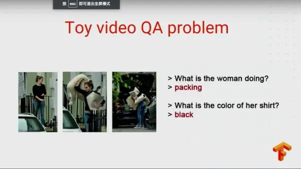 所以之后Keras的用户可以更快的在TensorFlow的框架下做出相应地模型,能更方便地进行分布式训练,使用Google的Cloud ML, 进行超参,还有更更重要的:TF-Serving。 这些feature现在好像还没有支持,不过应该很快了,大家可以期待下。 这里,Francois Chollet使用Keras构造了一个Video-QA的model,这个模型在Keras的官方文档也有描述,具体可以去那边看看,大概是这样一个场景: