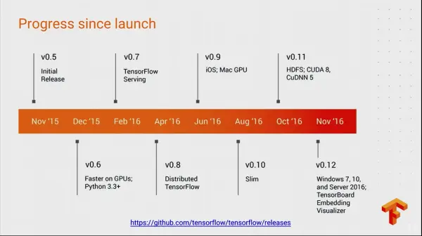 过去1年,TensorFlow从最开始的0.5,差不多一个半月一个版本: