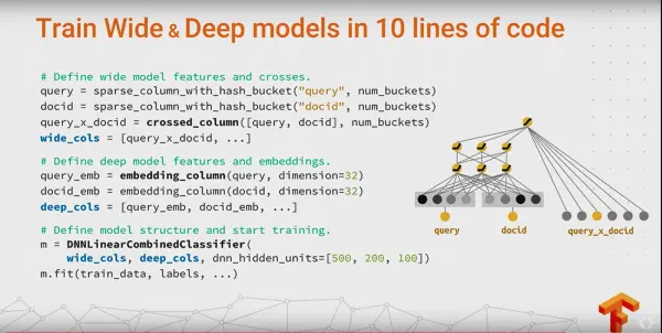 而上面提到的Wide & Deep Learning Model在Tensorflow下仅仅只需要10行代码来实现(突然想起了那个100美元画一条线的故事):
