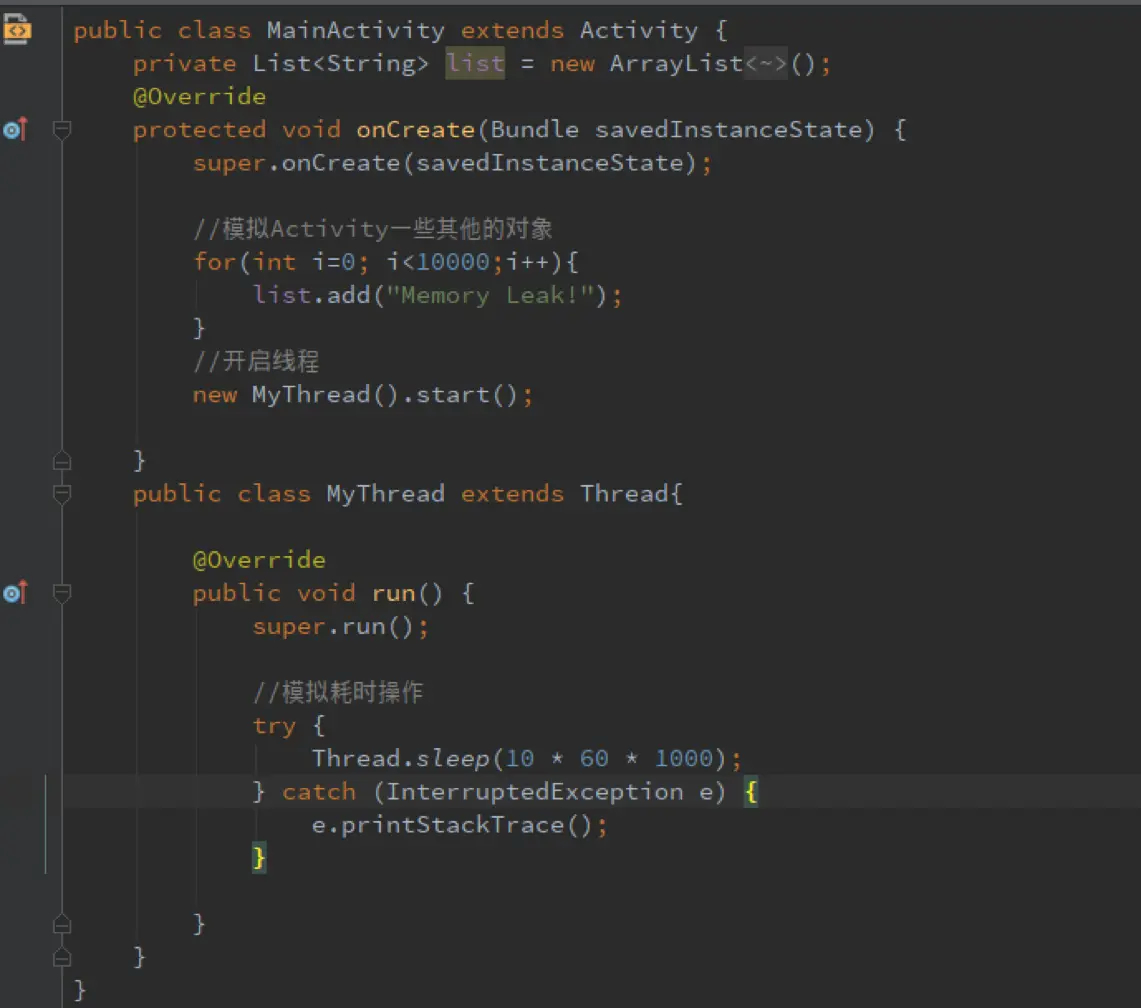 这里的截图是我故意生成的一个能引起内存泄漏的例子,点击上图右上方的Analyzer Tasks按钮,若代码中存在内存泄漏隐患,在其下方会列出可能引起内存泄漏的Activity,如上图右下方的Leaked Activities,之后我们便可以结合左下方Reference Tree中指出的问题分析,如果你有源码的话还可以索引源码(右键->Jump to source)。实例代码如下: