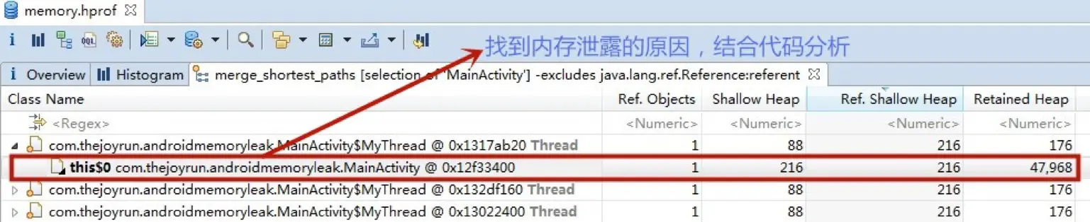 如图所示,这里列出了MainActivity和其内部类MyThread的对象个数即占用的内存大小,接下来我们选择一个条目右键—>Merge Shortest Paths to GC Roots(查看一个对象到GC Roots是否存在引用链相连接)->Merge Shortest Paths to GC Roots(排除虚引用/弱引用/软引用等等),