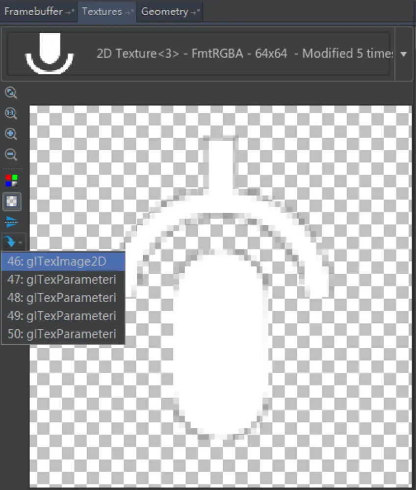 在GPU Commands面板中选择一帧(生成这一个由多个Draw函数完成,在Draw函数中又有多个openGL ES方法),Framebuffer 面板显示的内容取决于最后一个方法。