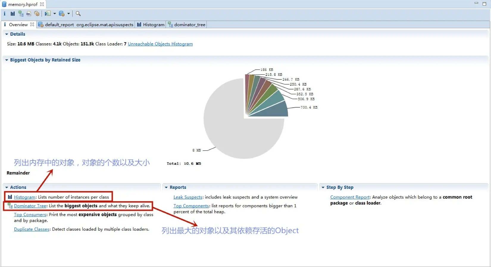 MAT(Memory Analyzer Tool),一个基于Eclipse的内存分析工具,是一个快速、功能丰富的JAVA heap分析工具,它可以帮助我们查找内存泄漏和减少内存消耗。使用内存分析工具从众多的对象中进行分析,快速的计算出在内存中对象的占用大小,看看是谁阻止了垃圾收集器的回收工作,并可以通过报表直观的查看到可能造成这种结果的对象。