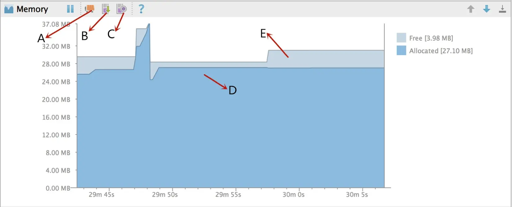 正常情况下,上图中的D区域会随着时间的走势慢慢上升(就算你与APP没有任何交互),直到E区域被用完,则会触发GC操作,释放内存,周而复始。如果你发现你的应用是静态的,但是E区域的内存很快就被用完了,即频繁的触发GC操作,这时你就应该引起重视,说不定你的代码中就存在着引起内存泄漏的隐患。