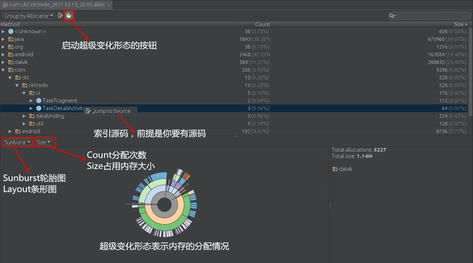 如上图,我们可以看出这次操作中应用里的各个组件的分配次数与占用大小,若发现这两个数据有异常(分配过多,占用过大),同样可以索引源码优化(前提是你有),最下方的视图是以另一种较酷炫的方式呈现,感兴趣的可以具体结合文件操作。
