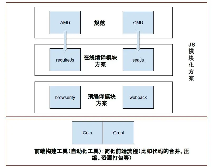 webpack和browserify它们是一个预编译模块的方案,不需要在浏览器中加载解释器。在本地直接写js,不管是AMD/CMD/ES6风格的模块化,它都能识别并编译成浏览器认识的js。