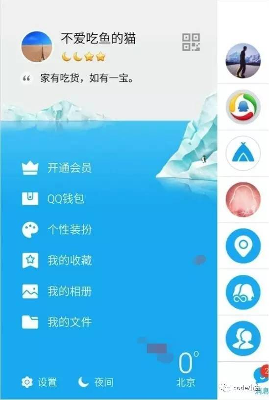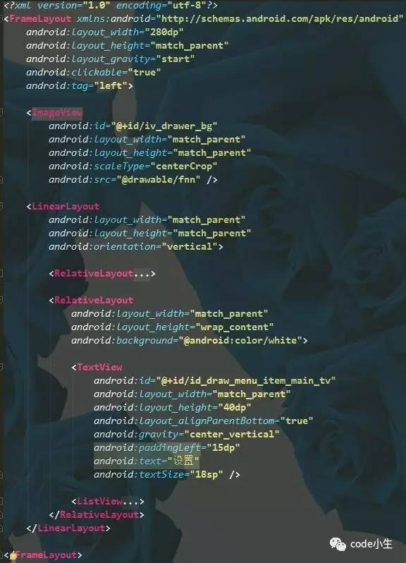 说明:采用层布局形式,底部放一张图片,在代码中设置动画效果就很方便了;注意到这里在最外层加了一个tag属性,此属性在DrawerLayout监听判断时会用到。同样这里也有被折叠的布局,RelativeLayout是个人信息布局;下面折叠的是ListView。