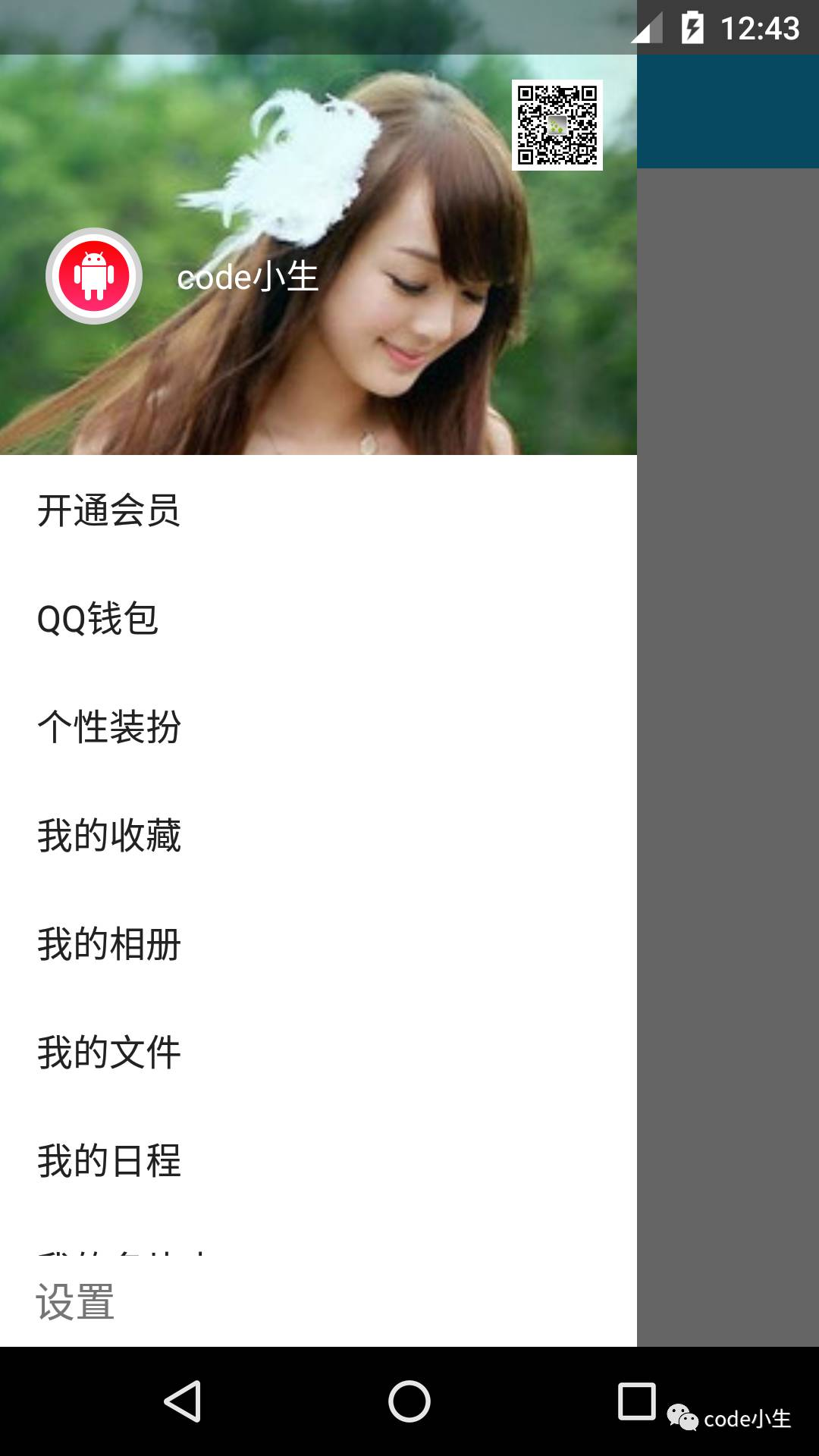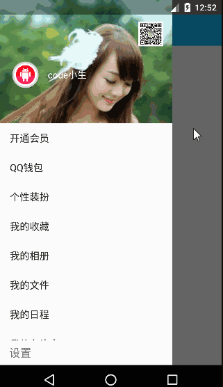 说明:实现的效果图 (此图是模拟器,建议使用真机,效果更明显,尤其是状态栏),设计的知识点:状态栏的设置,渐变效果;属性动画;TabLayout使用;最主要的DrawerLayout的使用。下面就来看代码片段: