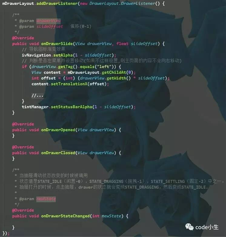 说明:关键部分,左侧DrawerLayout监听,在滑动的过程中,不断改变状态栏的透明度,并设置内容的移动,以及首页导航图标的渐变。