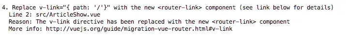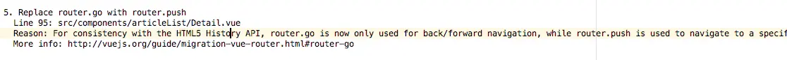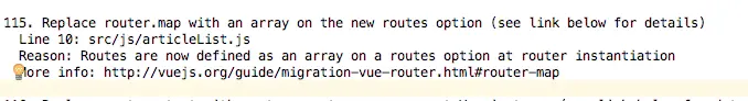 官方迁移的辅助工具,用以遍历查找出需要迁移的地方。识别出旧有的特性后,就会告知并给出建议,同时附上关于详细信息的链接。 - vue-router 2.x 官方文档