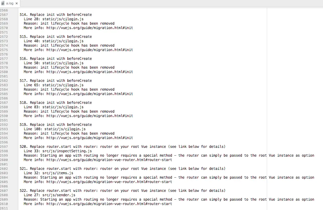 vue-migration-helper >a.log输出一看,WTF!!!500多个迁移点,网上人家迁移就几十个迁移点。呵呵哒了。