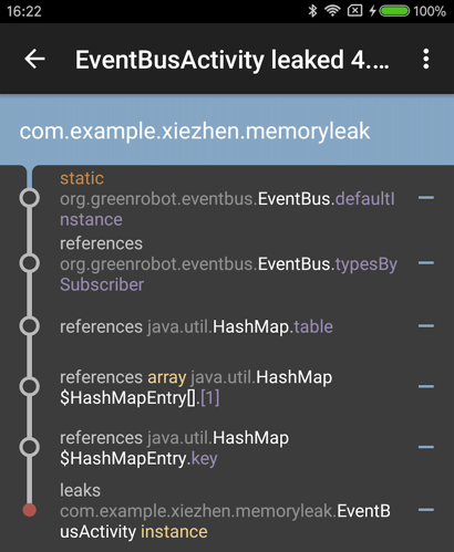 EventBus 我相信大家都不陌生,我们一般在使用 EventBus 的时候,都会使用EventBus.getDefault( ) 方法来获取一个 EventBus 单例,这个单例是静态的,全局可访问的。上面的代码我们在获取 EventBus 单例后调用 register 方法,将 EventBusActivity 注册到 EventBus 中,这个时候 EventBus 就会持有 Activity 的引用,由于单例是静态的,生命周期和整个 App 生命周期 一致,如果我们不调用 unRegister 方法的话,EventBusActivity 实例就会泄漏。上述代码中,我特意没有去调用 unRegister 方法,我们来看看 LeakCanary 的结果: