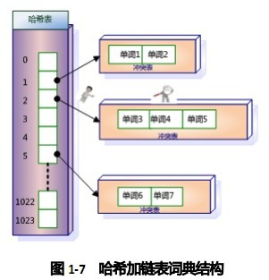 主体部分是哈希表,每个哈希表项保存一个指针,指针指向冲突链表,在冲突链表里,相同哈希值的单词形成链表结构。之所以会有冲突链表,是因为两个不同单词获得相同的哈希值,如果是这样,在哈希方法里被称做是一次冲突,可以将相同哈希值的单词存储在链表里,以供后续查找。