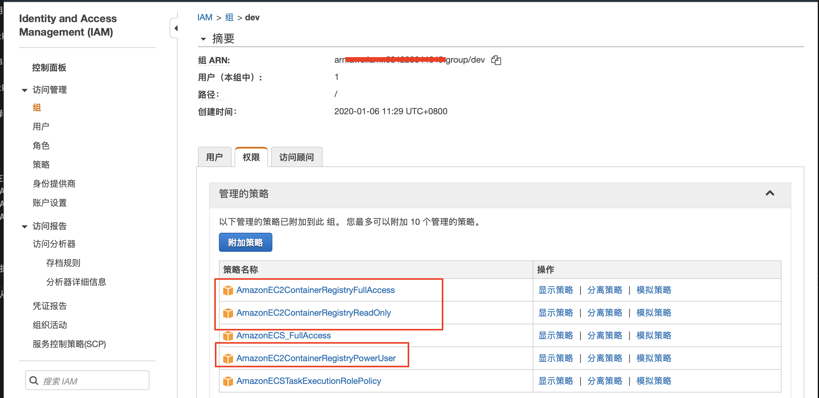其中红框部分是使用ECR的必要权限,ECR就是aws上的docker镜像仓库,每个用户都拥有一个。