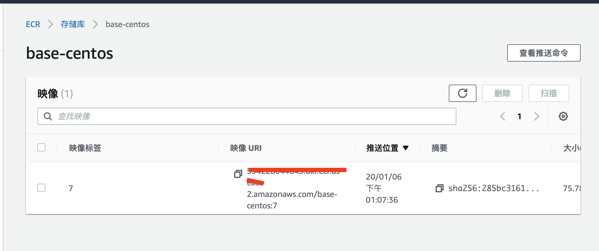 先登陆到aws控制台,打开ECR,创建一个base-centos仓库,再执行push命令,才能push上去。