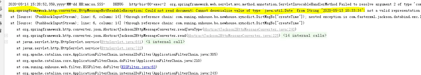 org.springframework.http.converter.HttpMessageNotReadableException: Could not re 田野麦苗 2020-05-14 240 阅读1分钟 接口入参日期格式 yyyy-MM-dd HH:mm:ss,后端jackson反序列化失败,yyyy-MM-dd HH:mm不是有效的格式 解决方法: 在对应字段上加上注解 @JsonFormat(shape = JsonFormat.Shape.STRING, pattern = "yyyy-MM-dd HH:mm:ss", timezone = "GMT+8")