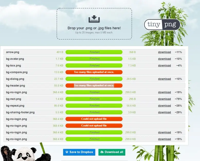 然而,这么好用的压缩工具有一个很明显缺陷的,就是每天只能正常压缩 20 张图片。超过 20 张之后,就会经常出来 Too many files uploaded at once。如下红色的部分: