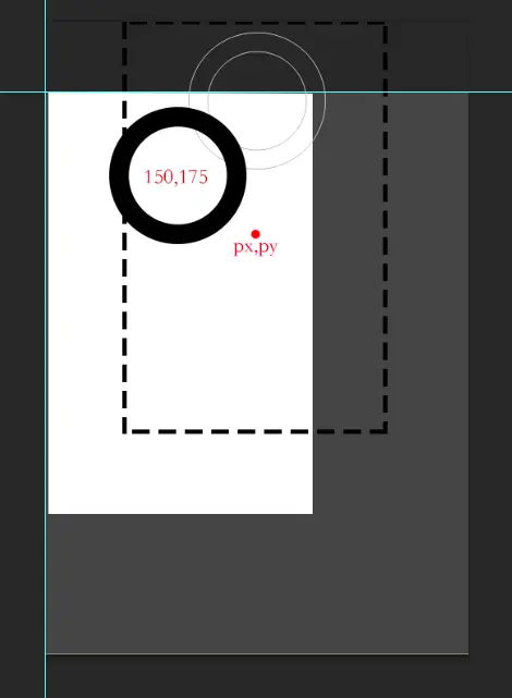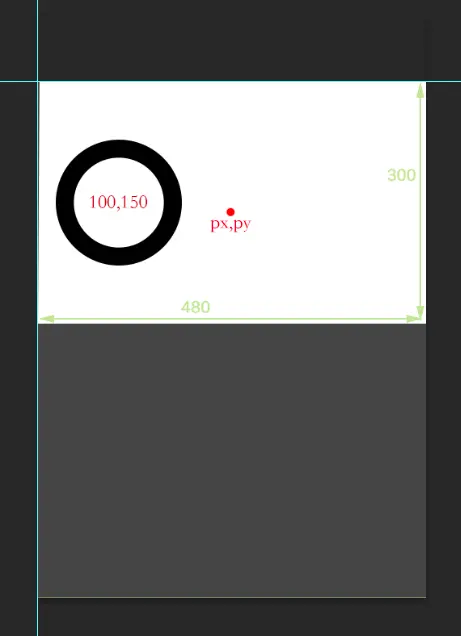 如上图,假设灰色区域为手机显示屏幕,白色部分则为一张图片,图片大小为480x300,在图片中画了一个涂鸦即圆心为(100,150)的空心圆。