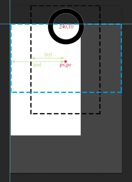 上图则为原图片(黑色虚边矩形)绕着中心点(px,py)顺时针旋转90度后(蓝色虚边矩形),将图片重新显示在屏幕中(白色部分)。然后同样把空心圆绕着中心点(px,py)顺时针旋转90度,得到的圆心坐标为(240,10),会发现旋转后空心圆的位置相对于图片产生了差异。原因很简单,旋转后的图片本该在上图黑色虚边矩形位置,但在显示图片时却是白色部分,因此图片发生了偏移但圆心的坐标却没有发生偏移。解决方法则是把圆心坐标进行偏移: x = x + py - px,y = y - (py - px)