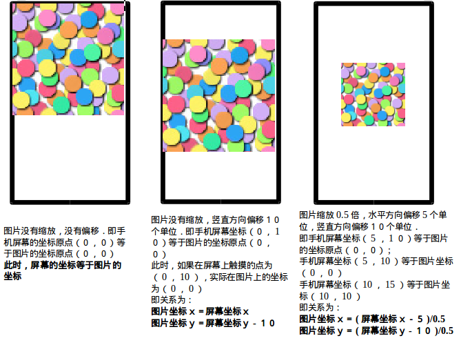 图片坐标x=(屏幕坐标x-图片在x轴上的偏移量)/图片缩放倍数