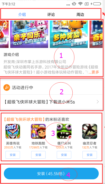 看上去,这个页面很复杂了,分析一下UI结构,不全部展开,大概分成五个部分,最上方的三个TAB(介绍,评论,周边)、游戏滑动宣传图Banner、游戏活动、游戏推荐位、游戏安装。