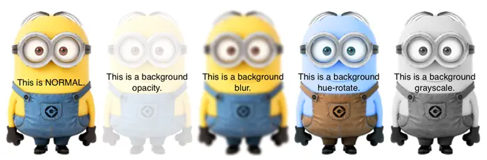 }因此,你可以给图片使用过滤效果,然后填充到元素中,比如background-filter、background-opacity、background-blur等等。