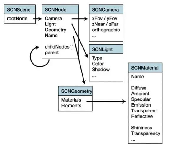 Scne Kit是基于节点的框架,基本可以用于大型场景图形下简单的建筑和渲染。而在本篇教程中你所要创建并修改的SCNScene对象提供了一个rootNode属性,你可以将其他的SCNNode对象作为它的子节点,这样就可以形成如下图所示的结构树: