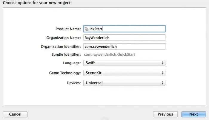 将项目命名为QuickStart,选择开发语言为Swift,然后游戏选用的平台技术选择为Scene Kit,其他的项目保持原样。接着点击Next,选择你的创建目录然后点击Create。