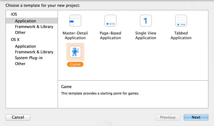打开你的Xcode 6然后新建一个项目,选择iOS/Application/Game模板然后点击Next。