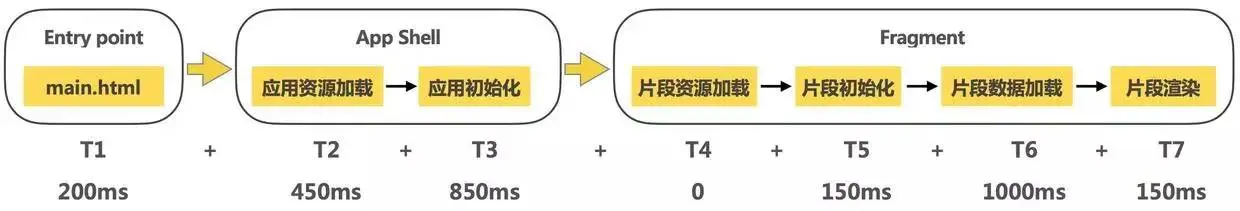绝大多数的单页式应用都符合 Application Shell 架构,根据这个架构我们可以看出一个应用首屏呈现节点可以分解为:请求入口页 -> 渲染应用外壳 -> 渲染首屏片段。我在此基础上进一步将三个节点细分如下: