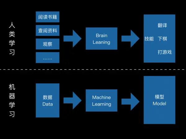 在讨论机器学习之前,我们首先看看人类是如何学习的。如图1上半部分所示,人类通过阅读书籍、查阅资料,观察得到信息,这些信息经过人脑学习,最后习得了某种技能。