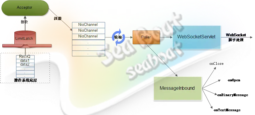 如图,对于WebSocket的客户端连接被接收器接收后注册到NioChannel队列中,Poller组件不断轮休是否有NioChannel需要处理,如果有则经过处理管道后进到继承了WebSocketServlet的Servlet上,WebSocketServlet的doGet方法会处理WebSocket握手,告诉返回客户端同意升级协议。往后Poller继续不断轮休相关NioChannel,一旦发现是使用WebSocket协议的管道则会调用MessageInbound的相关方法,完成不同事件的处理,从而实现对WebSocket协议的支持。