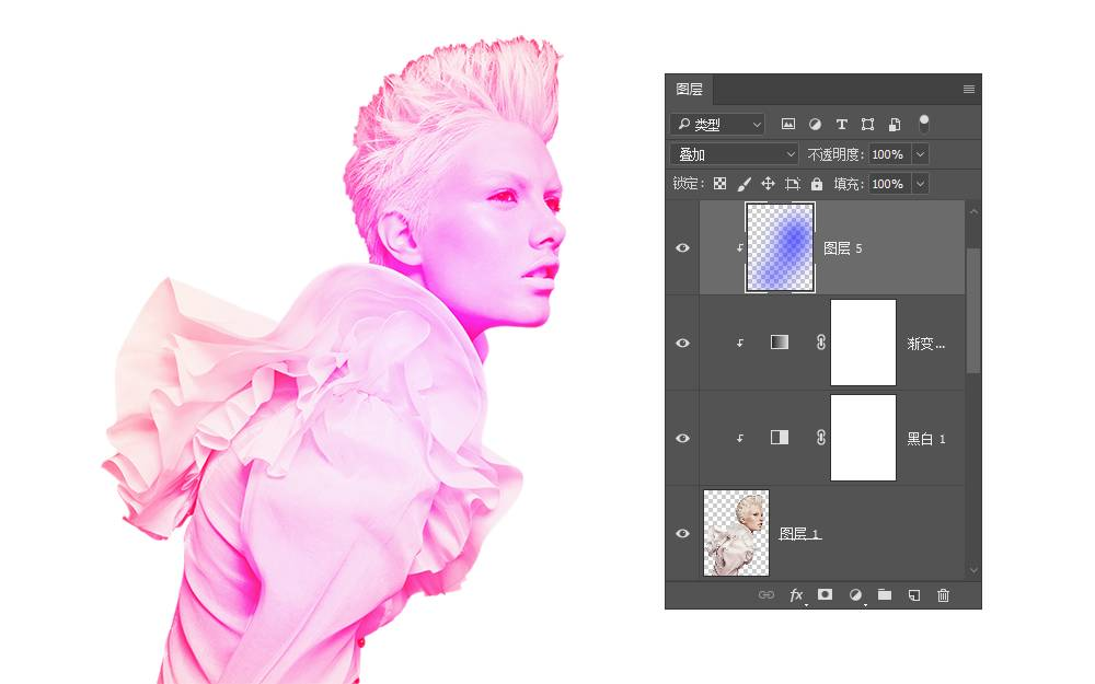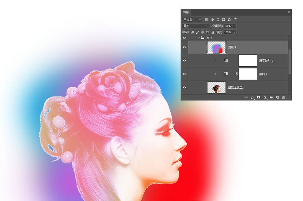 色彩的丰富层次除了在渐变隐射的部分进行调整,还可以在渐变隐射的调整图层之上再增加一个新图层,将这个图层的混合模式改为“叠加”,然后用大而软的画笔为人物增加更多的色彩。