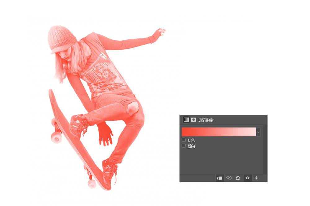 关闭已经做好的人像图层以及跟随它的两个调整图层,打开另一个人像的图层可见按钮。也按照相同的方法为其调色,在渐变映射时选择的是红色的渐变。