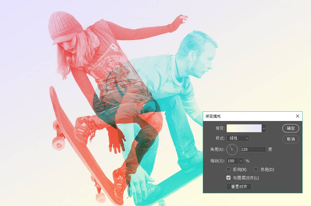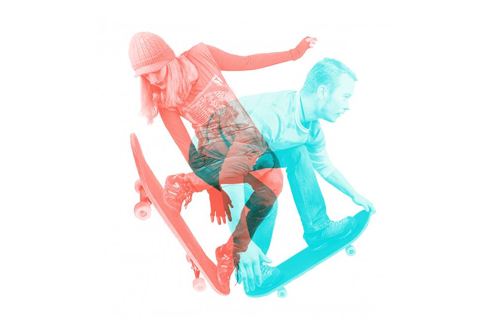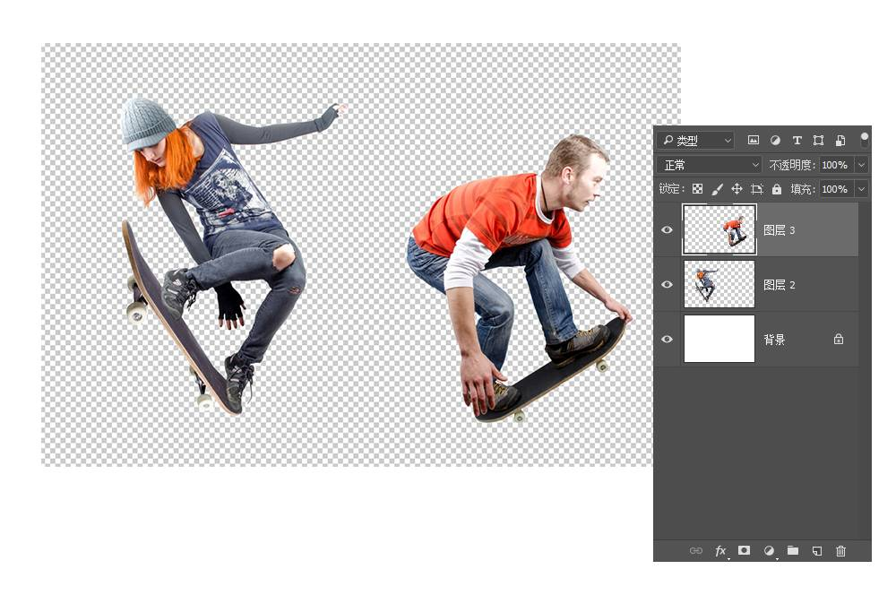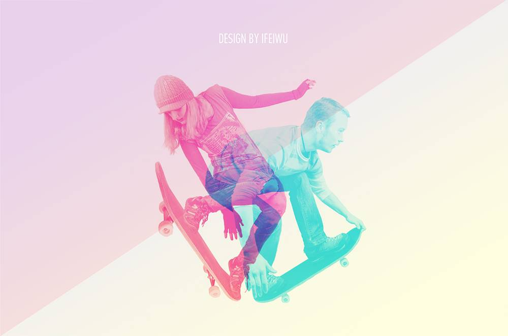 首先,是选择两个不同的人像重影,在此我们运用滑板运动的人物造型,体现某种运动中的姿态韵律。你也可以选用其他的动态人物比如舞蹈、跳水、溜冰等等。之所以选择动态造型,主要是为了取其姿态的灵动感,将其有机结合。