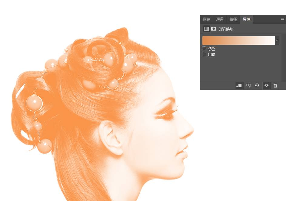 对其进行去色和渐变隐射的处理,这时需要注意对色彩的控制和搭配,在配色前应对整体色彩有个规划。我们在此给这个头像增加的浅橙色的渐变映射。
