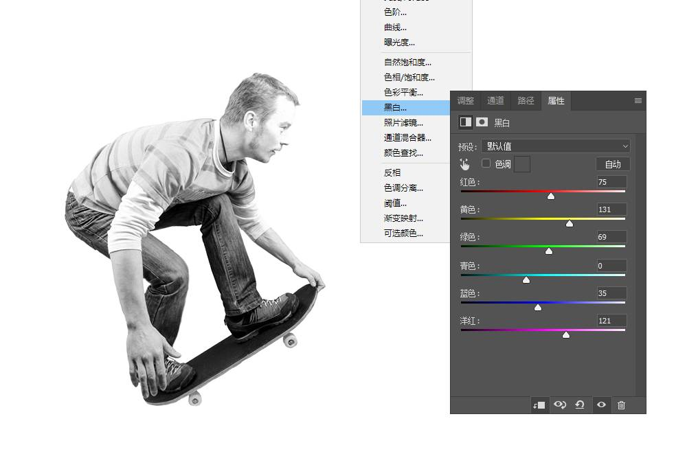 如果你的素材本身并非黑白,那就要先将其做“去色”处理,为该图层增加【黑白】调整图层,适当滑动各种色彩的调控滑块,使黑白的色调也能保持一定程度的美感,所谓黑白的色调美感即整个照片中保持“高中低”三种灰调子的均匀和谐。