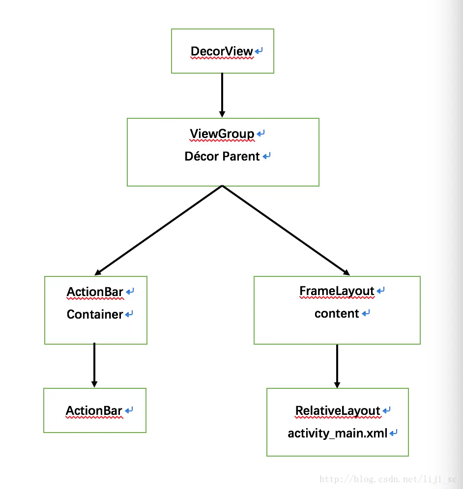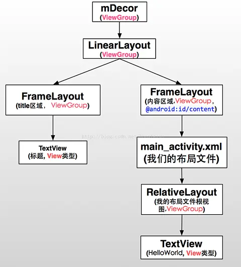 可以看出,DecorView中包含一个Vertical的LinearLayout布局文件,文件中有两个FrameLayout,上面一个FrameLayout用于显示Activity的标题,下面一个FrameLayout用于显示Activity的具体内容,也就是说,我们通过setContentView方法加载的布局文件View将显示在下面这个FrameLayout中。