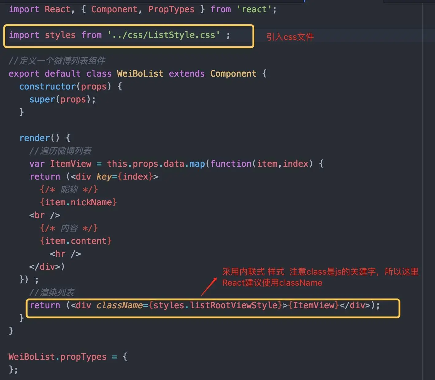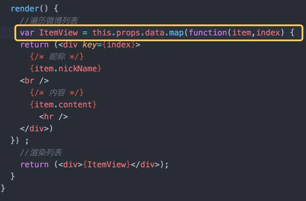 如图所示:我们修改的部分为黄色部分,最终WeiBoList.js为