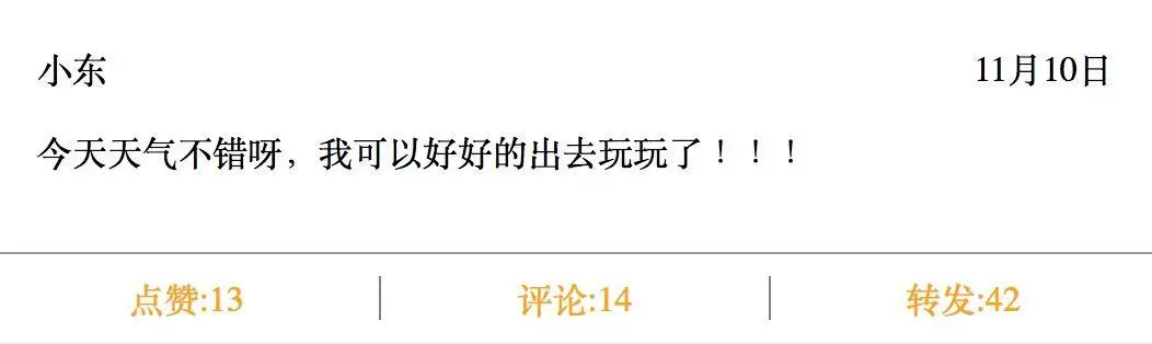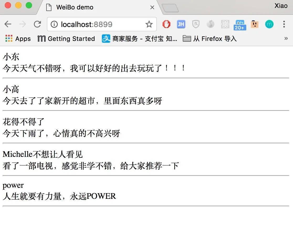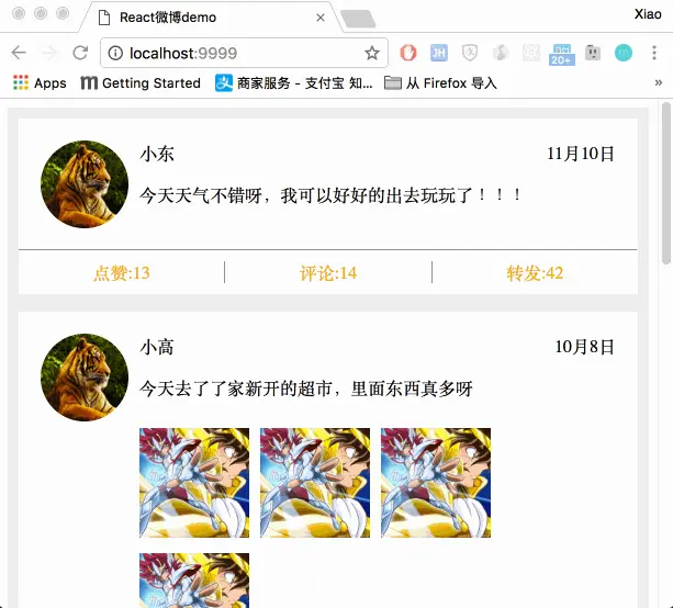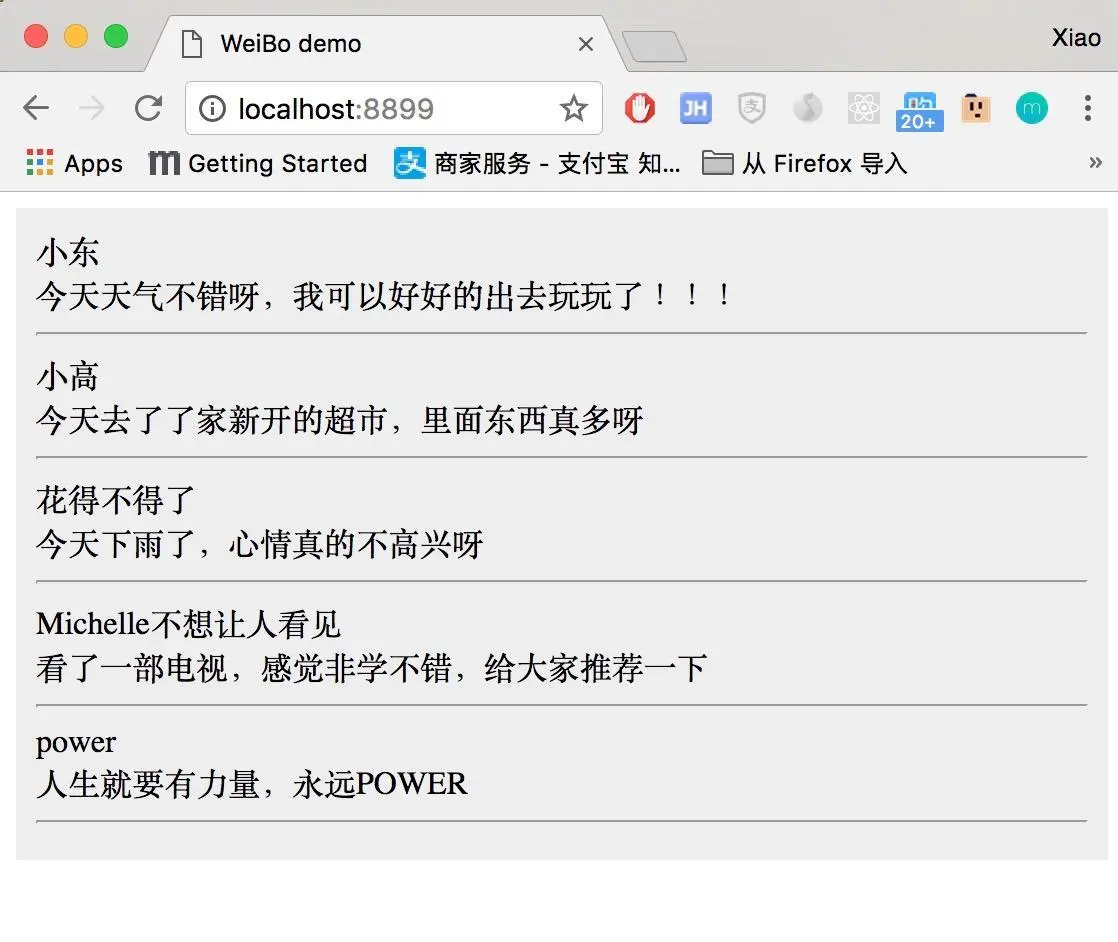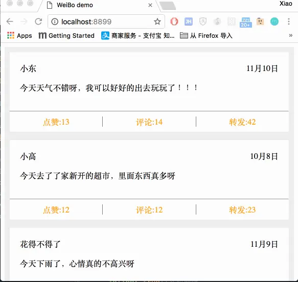 到此为止,我们就把微博的基本雏形搞出来了,下一节我们把评论组件和头像等做出来,并且添加事件交互 。
