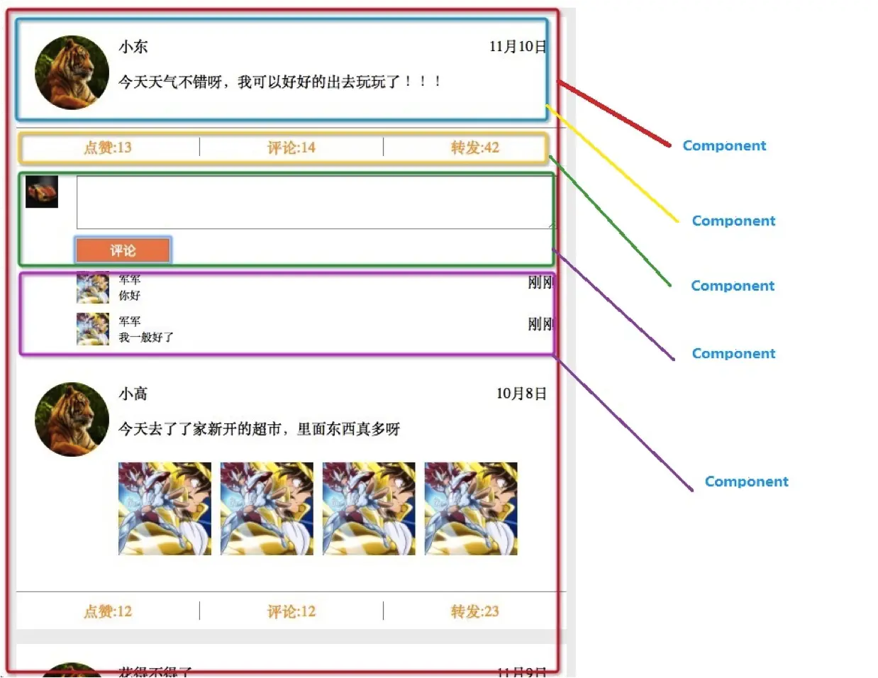 首先我们把微博组件化,如何划分组件呢,我们以下图为划分组件的标准,当然这不是唯一标准,只是我觉得比较好的组件分的方式。
