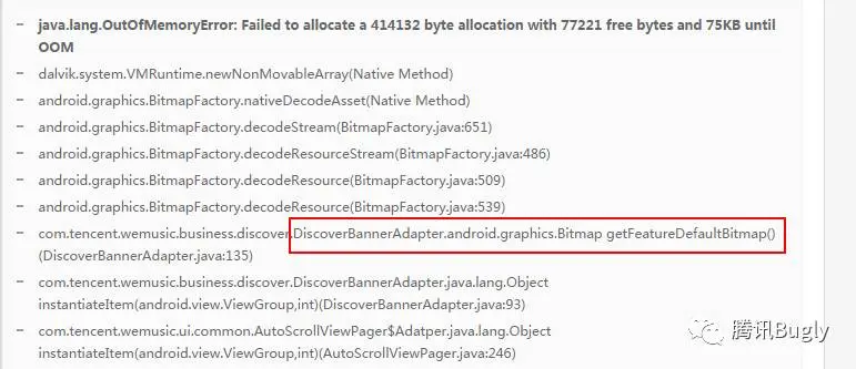 下面这个crash就是上面提到的在LsitView的adapter里不停创建bitmap,这个地方是我们的首页banner位,理论上App一打开就会缓存这张默认背景图片了,而实际在使用过一段时间后,才因为为了解码这张背景图而OOM, 改为用全局缓存解决。