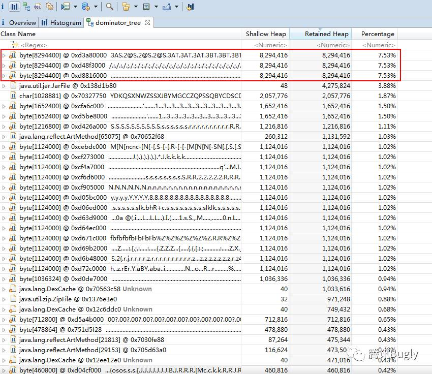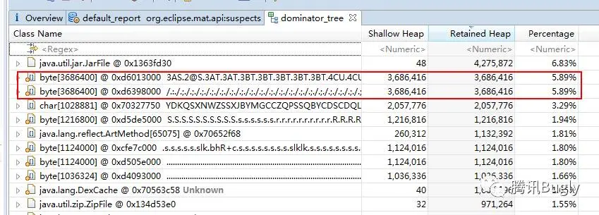 这里我们看的是Dominator Tree(即内存里占用内存最多的对象列表)。
