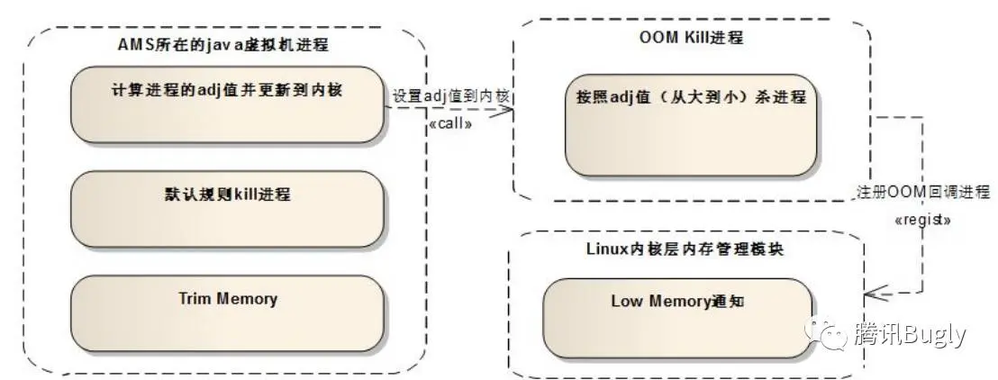 参考QCon大会上阿里巴巴的Android内存优化分享[2],这里最简单的理解就是ActivityManagerService会对所有进程进行评分(存放在变量adj中),然后再讲这个评分更新到内核,由内核去完成真正的内存回收( lowmemorykiller, Oom_killer)。这里只是大概的流程,中间过程还是很复杂的,有兴趣的同学可以一起研究,代码在系统源码 ActivityManagerService.java中。