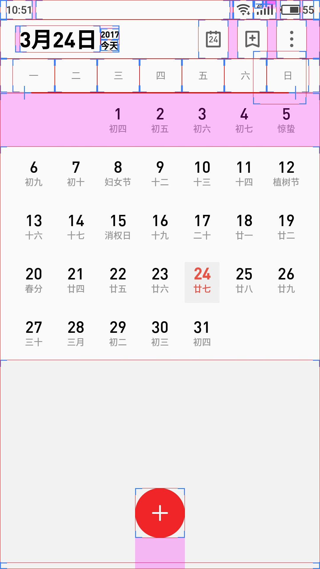 好吧,一开始我以为日历界面是ViewPager+RecyclerView的,但是这么一看明显就不是了,如果是RecyclerView,那么我们假设每个月的卡片都有5*7=35个item,每个item根布局是RelativeLayout+3个TextView,我们大概估算一下日历初始化时要加载的控件: