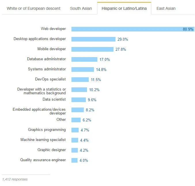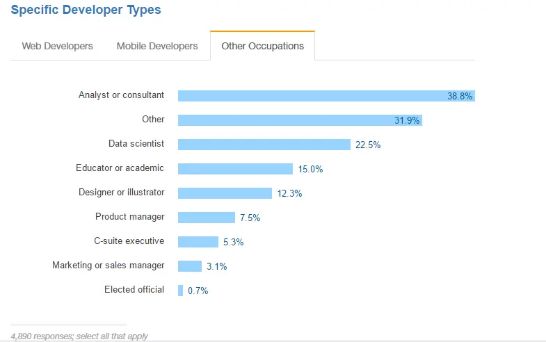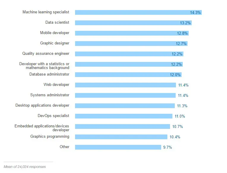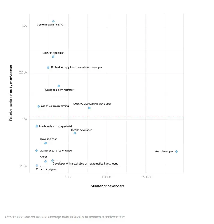 女性开发者主要集中在数据科学家、移动和Web开发者、质量控制工程师和图像设计师等职位上。