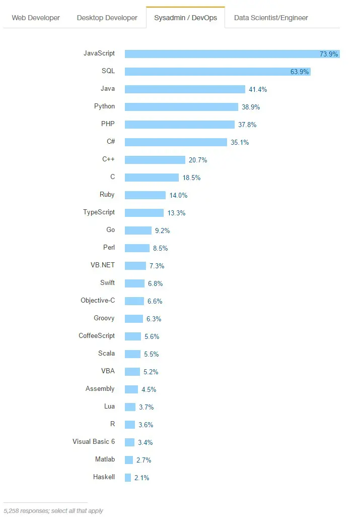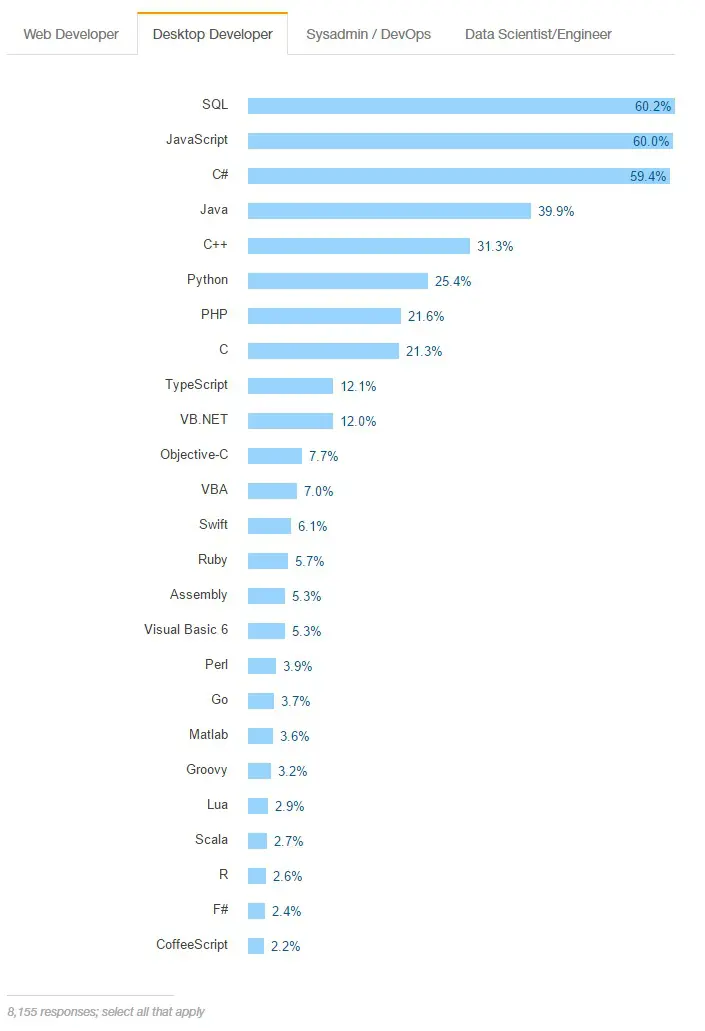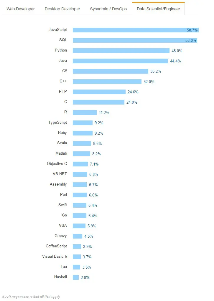 JavaScript和SQL成为Web开发者、桌面程序开发者、系统管理与和数据科学家最喜欢的语言。而相比于其他人,数据科学家更偏爱R语言。