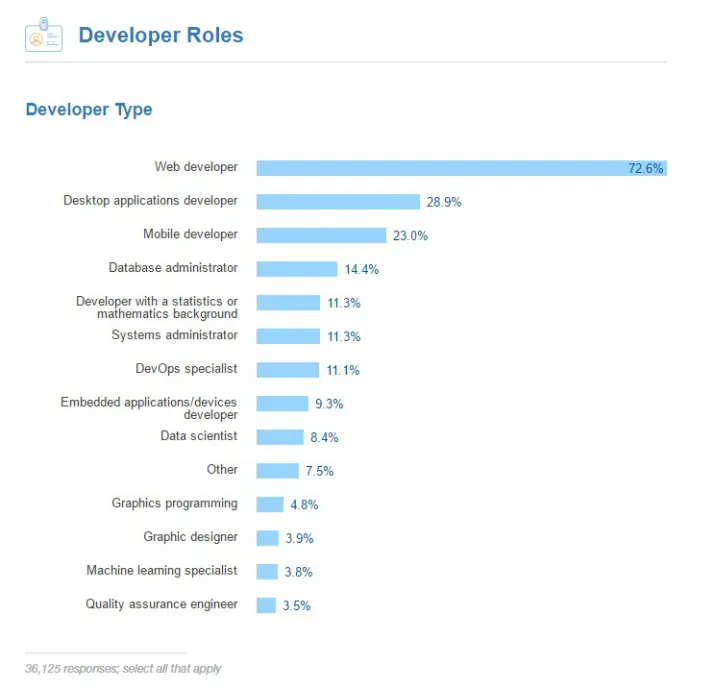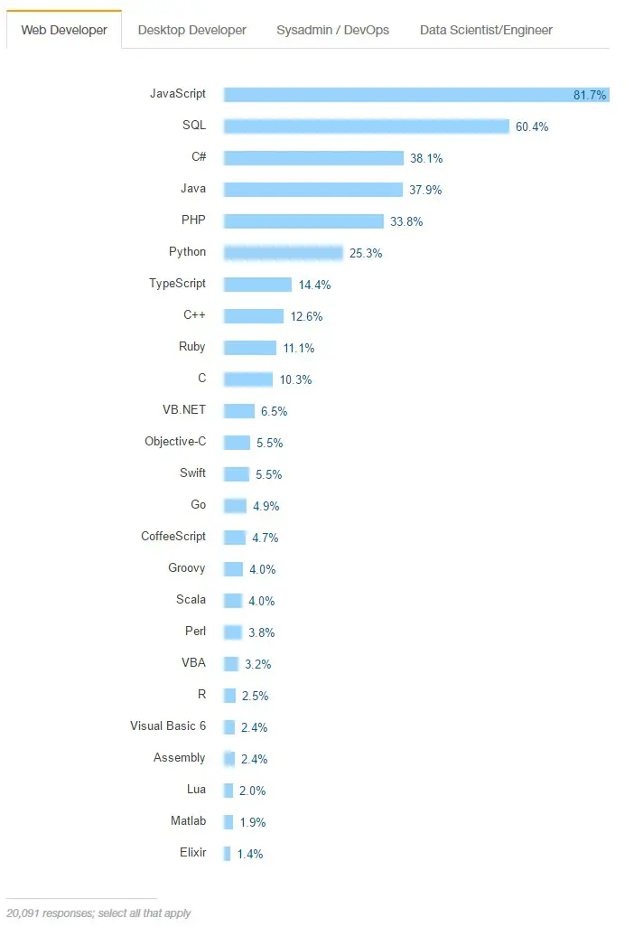 大约四分之三的受访者为web 开发者,但是其中也有很多人表示自己也在做桌面和移动应用的开发。