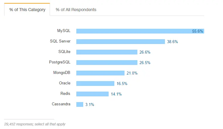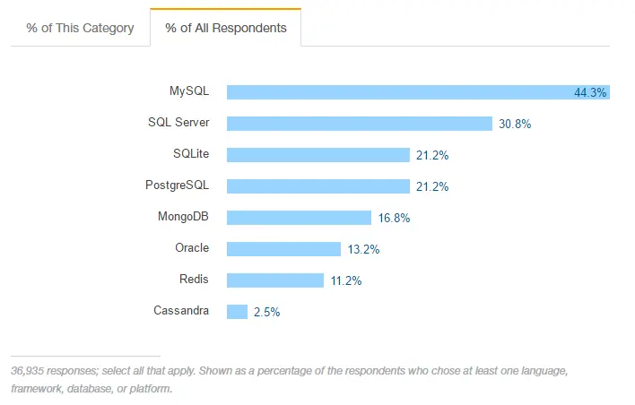 MySQL 和SQL Server 成为使用程度最高的数据库技术。